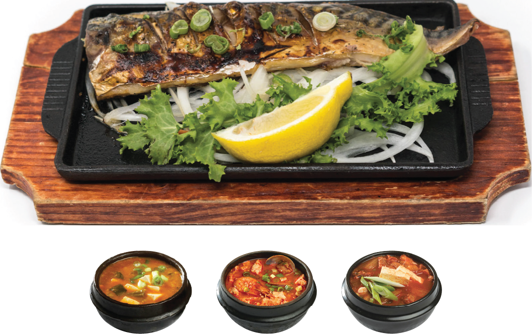 고등어 구이 + 된장 or 해물 순두부찌개 or 김치찌개
